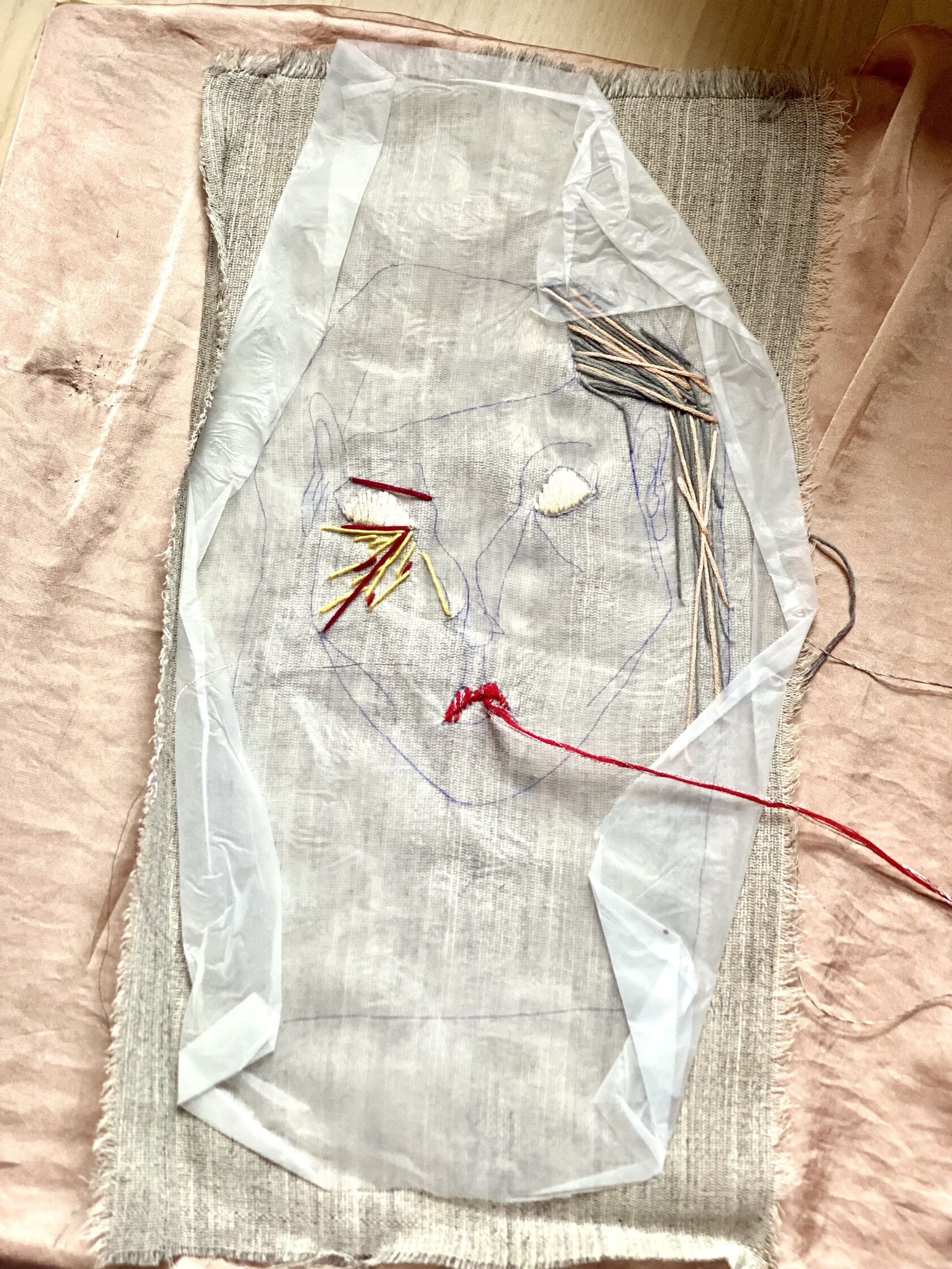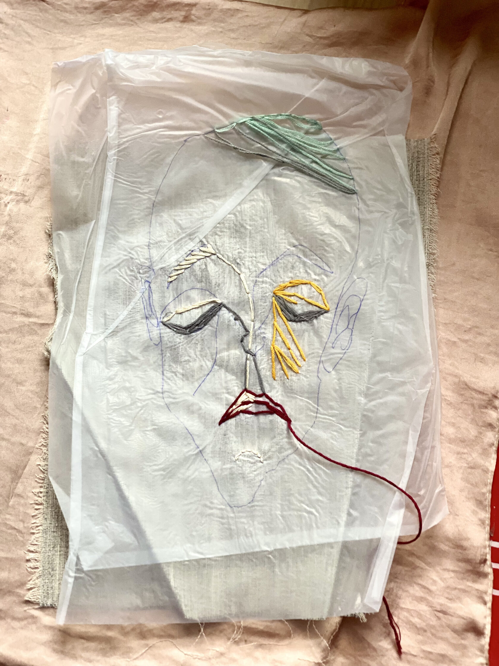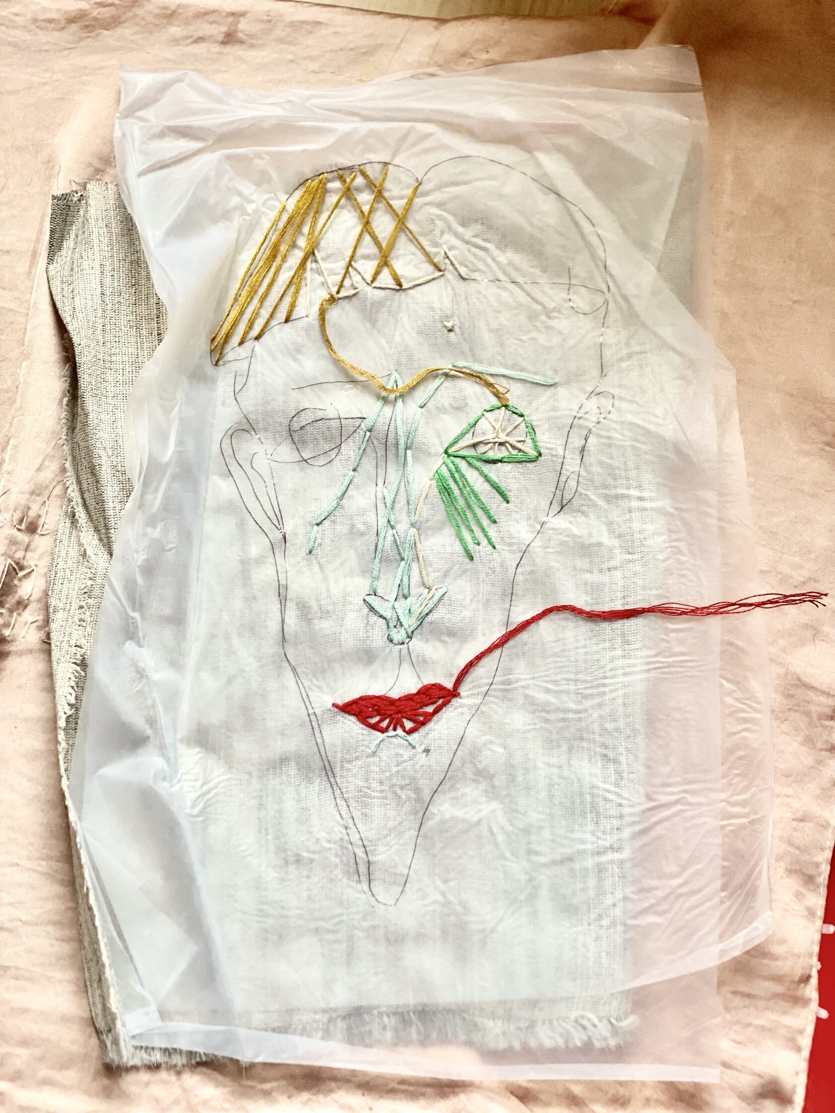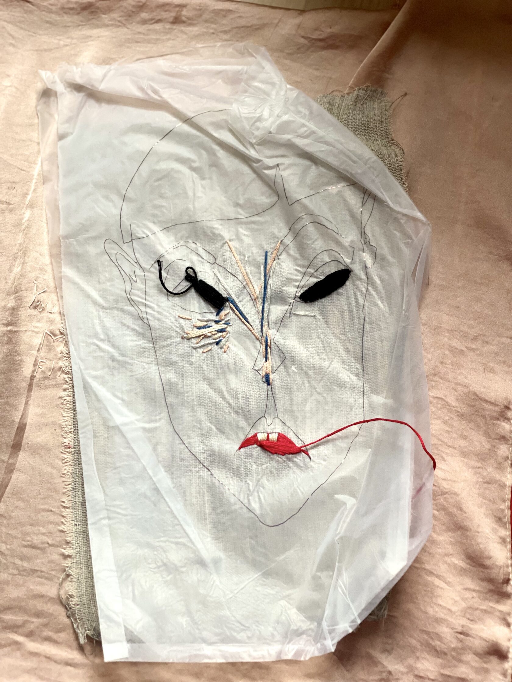 textile paintings using plastic, textile, and embroidery